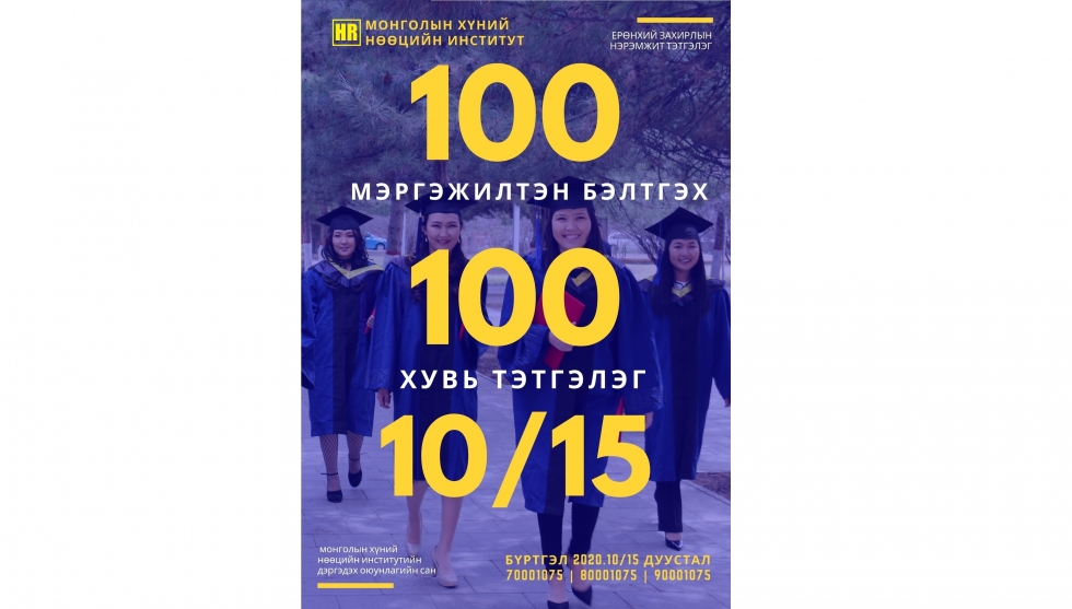 Ерөнхий захирлын нэрэмжит тэтгэлэг: 100 МЭРГЭЖИЛТЭН 100% -ТЭТГЭЛГЭЭР БЭЛТГЭНЭ.Монголын Хүний Нөөцийн Институт нийгмийн хариуцлагын хүрээнд хүний нөөцийн удирдлагаар суралцах ЧИН ХҮСЭЛ бүхий 100 ЗАЛУУСЫГ Хүний нөөцийн мэргэжилтнээр бэлтгэх 100% ТЭТГЭЛЭГ Үнэ төлбөргүй хөтөлбөрөө зарлаж байна.Тэтгэлгийн сан: 40,000,000₮Тэтгэлэгт хамтрагдах хүний тоо: 100Нэг суралцагчийн төсөв: 400,000₮Суралцах хугацаа: 21 хоногТэтгэлэгт хамрагдах маш энгийн:- Хүний нөөцийн салбарт ажиллаж мэргэших чин хүсэлтэй байх- Тэтгэлэг хүсэгчийн өргөдлийг бөглөж info@mhri.mn рүү илгээх / Тэтгэлэг хүсэгчийн өргөдөл- Их дээд сургууль төгссөн байх эсвэл 4 курст суралцаж буй оюутан байж болно- Хүний нөөцийн чиглэлээр ажилладаггүй байхМэдээж:Боломжийг бусдадаа түгээх үүднээс энэхүү постыг 3-с доошгүй найздаа SHARE хийж,https://www.facebook.com/mhrimongoliaхуудсанд LIKE дарсан бол маш их баярлах болноДэлгэрэнгүй мэдээллийг:70001075 | 80001075 | 90001075