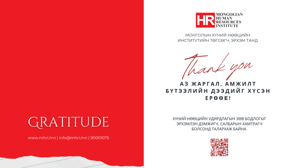 Монголын Хүний Нөөцийн Институтийн (MHRI) Хүний нөөцийн удирдлагын үндсэн сургалтын хөтөлбөрийг бүрэн дүүргэсэн (2022/03/21-04/08) #B374 (21 хоног) элсэлтийн дараах төгсөгчдөд (MHRI Level-B) түвшний сертификат олгосугай.