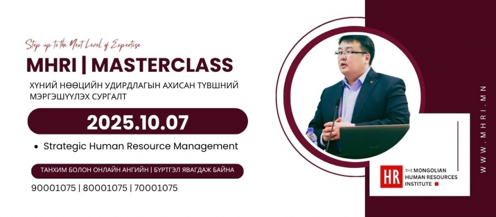 Танд байгууллагынхаа хүний нөөцийг удирдахад илүү бодлогын, илүү стратегийн түвшний оновчтой шийдвэр, илүү шинэлэг шийдэл гаргах шаардлага үүсэж байна уу? Бид Танд дараах шинэчлэгдсэн шинэ, практик сургалтын агуулгыг санал болгож байна. HR is not about HR - It's about the BusinessСТРАТЕГИЙН ХҮНИЙ НӨӨЦИЙН УДИРДЛАГА (SHRM) агуулгын хүрээнд зохион байгуулагдах АХИСАН ТҮВШНИЙ МЭРГЭШҮҮЛЭХ /MHRI - Advanced Level/ сертификат олгох сургалтанд урьж байна.Байгууллагын дээд шатны удирдлагууд, хүний нөөцийн менежерүүд, хүний нөөцийн алба, газрын захирлуудад зориулан боловсруулсан цогц хөтөлбөрөөр хичээллэнэ.Сургалтын түвшин: MHRI - Advanced Level / Ахисан шатХамрагдах хүрээ: Байгууллагын удирдах ажилтнууд, хүний нөөцийн албаны дарга, хүний нөөцийн менежерХичээллэх цаг: